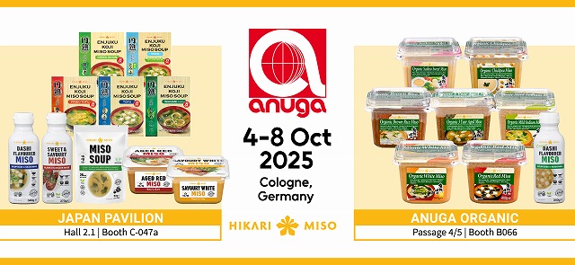 ひかり味噌株式会社※(長野県諏訪郡下諏訪町、代表取締役社長 林善博、以下 当社)は、2025年10月4日(土) ~ 8日(水)にドイツ ケルンで開催される欧州最大級の食品見本市 “ANUGA 2025”に出展する。出展ブースは、Hall 2.1に設置されるJAPAN PAVILION内のブースC-047a及び、オーガニック商品のみ出品ができる特設カテゴリーAnuga Organicエリア内のPassage 4/5に位置するブースB066の2カ所。JAPAN PAVILIONでは、ヨーロッパ向けの味噌及び即席みそ汁を中心に幅広い商品を出品し、Anuga Organicでは、ヨーロッパ向けのオーガニック商品である、7種類の味噌と液状味噌を出品する。