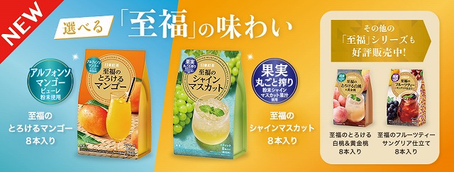日東紅茶ブランドを展開する、三井農林株式会社では、「至福シリーズ」の新商品として「至福のとろけるマンゴー8本入り」「至福のシャインマスカット8本入り」を2026年2月23日(月)より発売した。夏の長期化に伴い高まるアイスドリンク需要に応え、冷水で溶かすだけで楽しめるインスタント飲料「至福シリーズ」のラインナップを拡充。